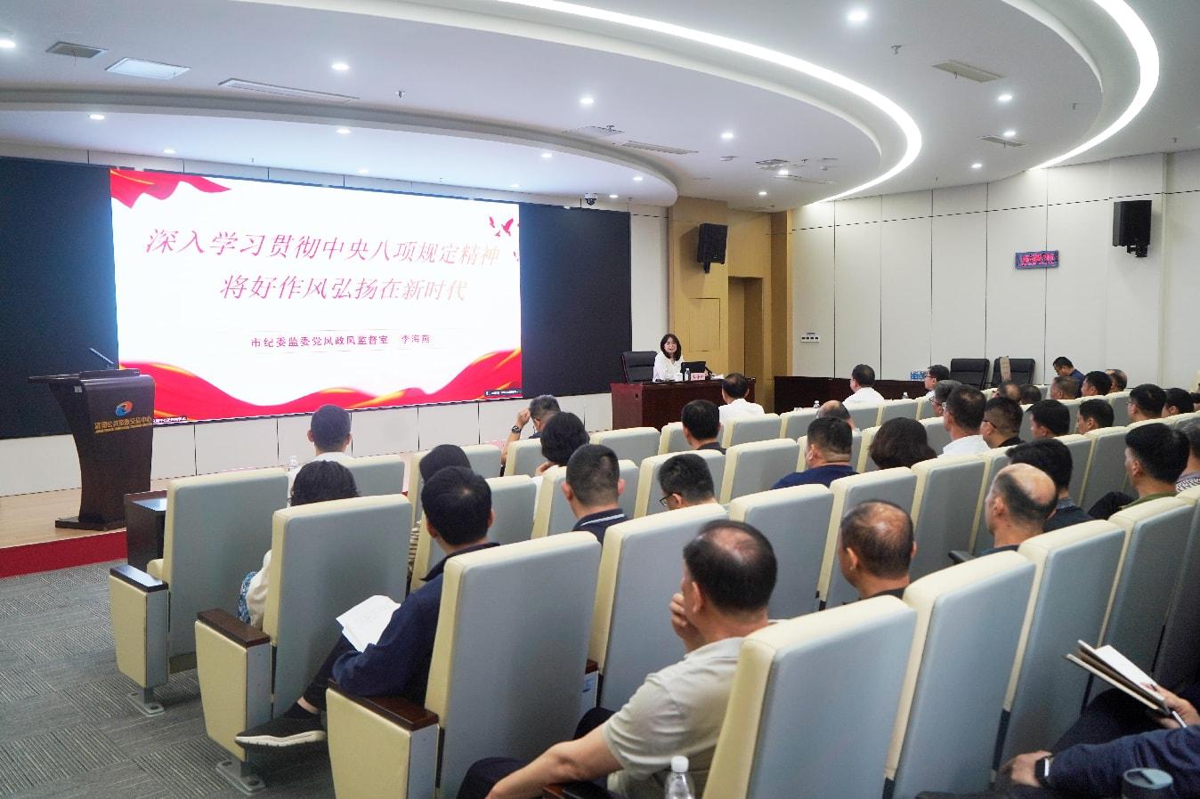 参观结束后,在交易中心召开深入贯彻中央八项规定精神警示教育会。会议由交易中心党组书记、主任马学凯主持,全体干部职工现场参会,各分中心通过视频方式参会。首先,党组成员、副主任吕飏通报了违反中央八项规定精神典型案例,用身边事教育身边人,进一步强化震慑效应。随后,市纪委监委党风政风监督室主任李海燕作专题辅导,从中央八项规定精神的重大意义、内涵要义切入,分析当前作风建设形势,结合典型案例深入剖析违反中央八项规定精神的主要表现,告诫每一名党员干部要心存“三个敬畏”、算好“三笔账”、注意“三种风”、听进“三个言”,做到自学、自觉、自警、自律,以优良的作风为省会经济社会高质量发展贡献力量。
