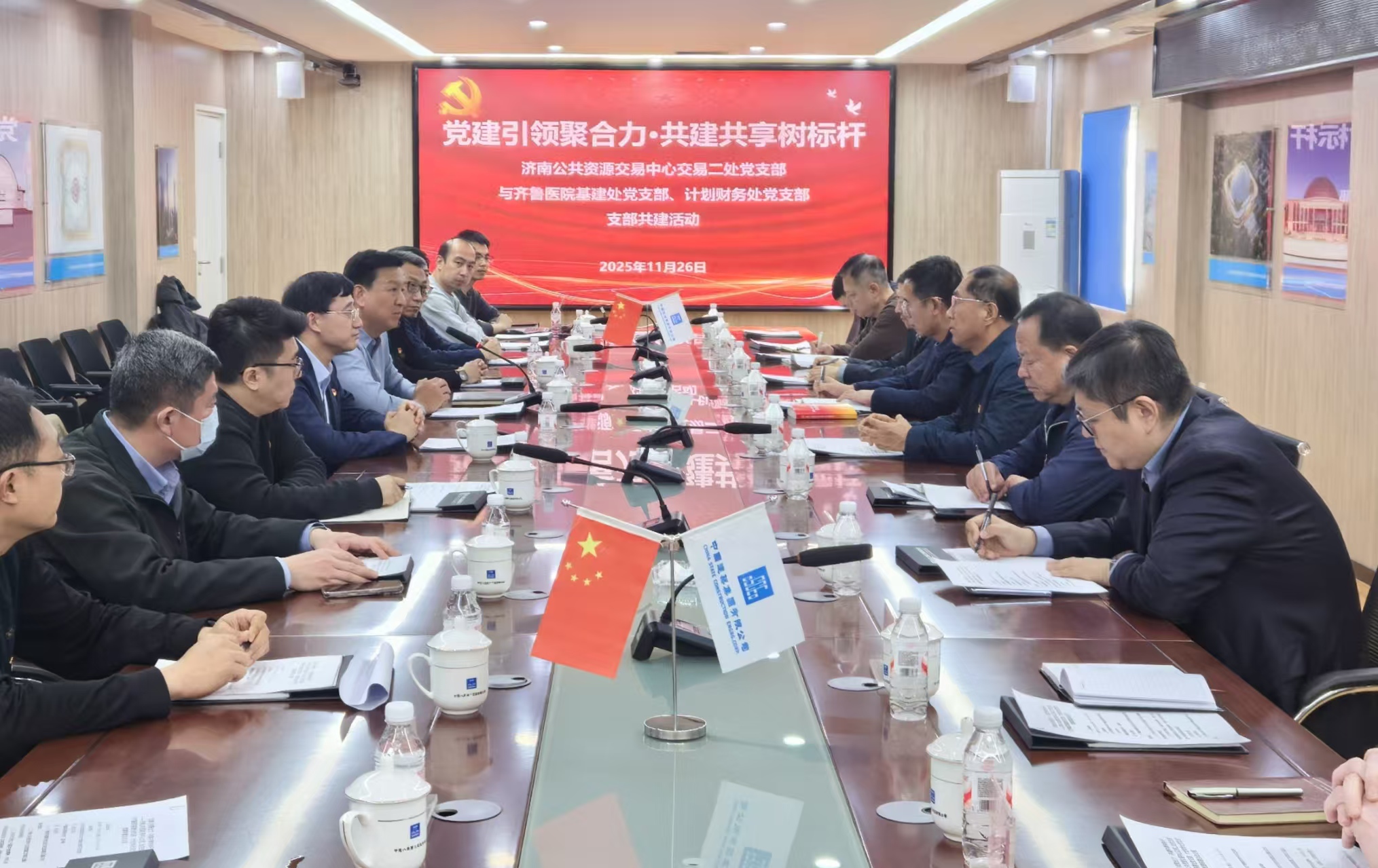 2025年11月26日,济南公共资源交易中心党组书记、主任马学凯带领交易二处党支部党员,赴山东大学国家医学攻关产教融合创新平台项目部,与项目部党组织联合开展以“党建引领聚合力·共建共享树标杆”为主题的党建联建活动,以党建引领促业务协同、以组织共建促资源共享。